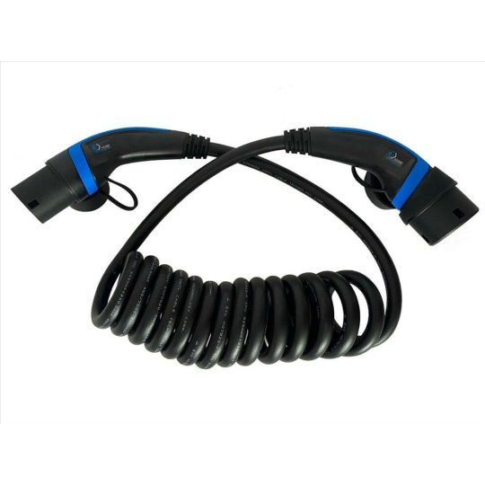 Kvalitní třífázový nabíjecí spirálový kabel s konektory typu 2 (Mennekes) a délkou 5 metrů nebo 8 metrů.